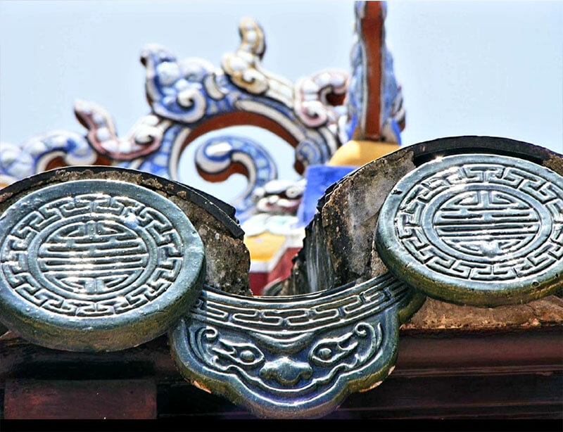 - Hoa văn chạm khắc: Hình ảnh rồng, phượng, mây trời thể hiện quyền uy hoàng gia.